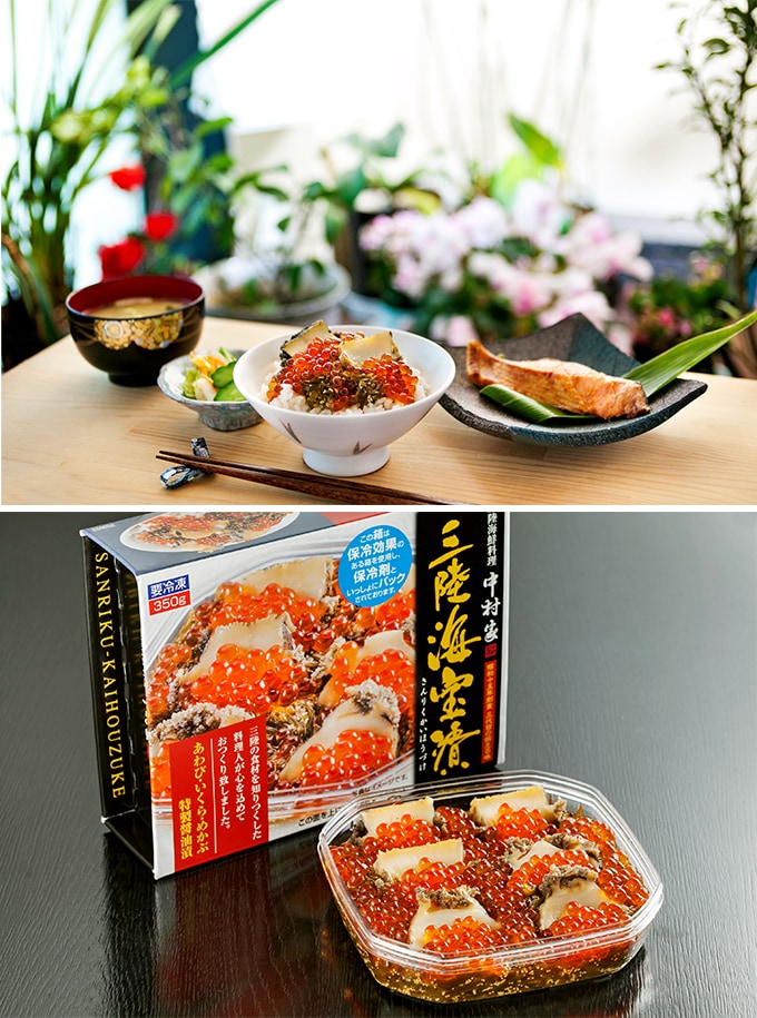 めかぶ醤油漬に、「だまし煮」という技法で柔らかく煮上げたあわびと、濃厚いくらをトッピングした中村家のベストセラー商品。あわび・いくら・めかぶは三陸産を使用した、まさに三陸の海の宝石箱です。炊き立てご飯にのせてどうぞ。
