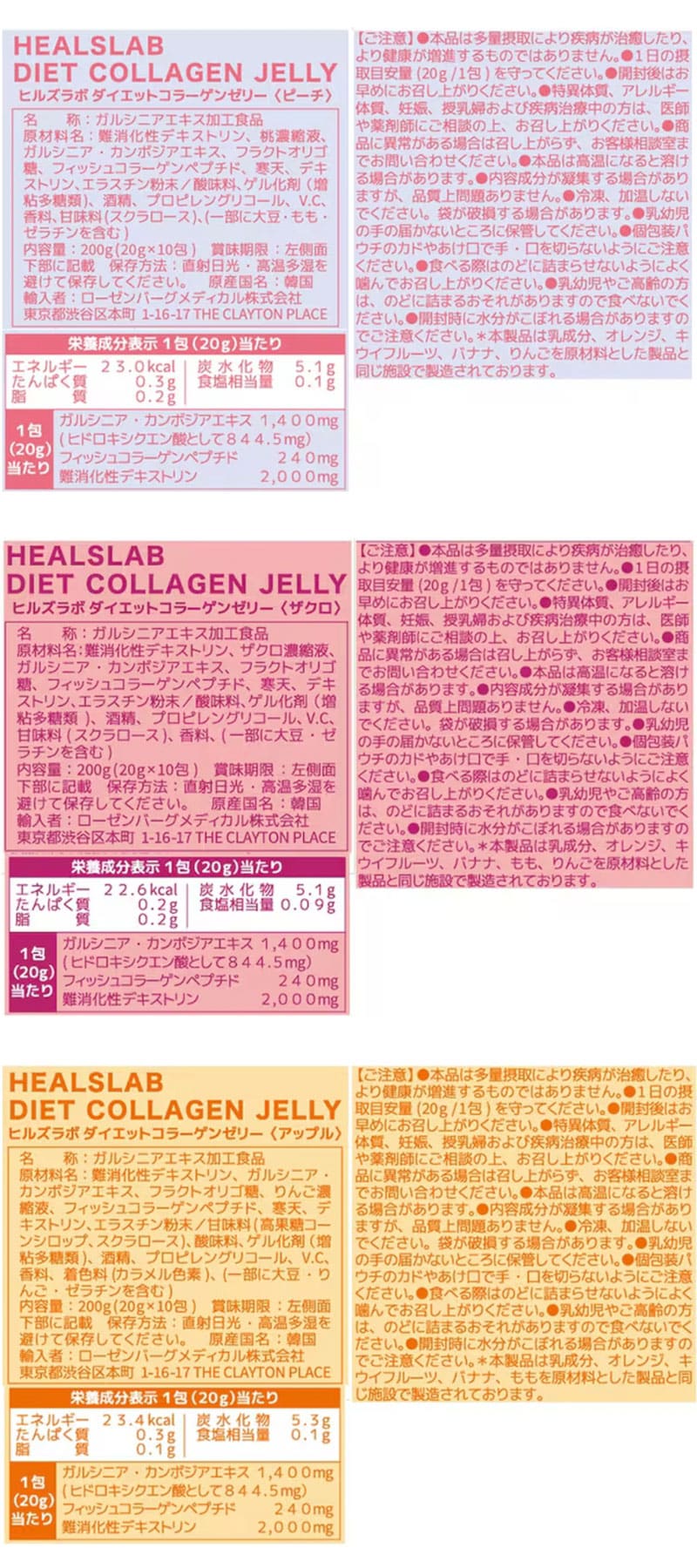 難消化性デキストリン、ガルシニア・カンボジアエキス、フラクトオリゴ糖、りんご濃縮液、フィッシュコラーゲンペプチド、寒天、デキストリン、エラスチン粉末/甘味料(高果糖コーンシロップ、スクラロース)、酸味料、ゲル化剤(増粘多糖類)、酒精、プロピレングリコール、V.C、香料、着色料(カラメル色素)、(一部に大豆・りんご・ゼラチンを含む)