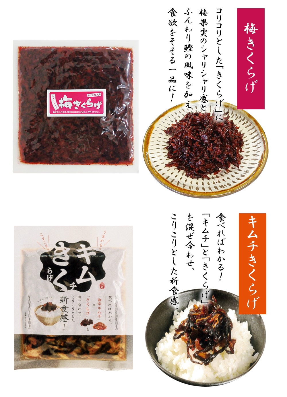 醤油(国内製造)、砂糖、調味梅漬(梅、食塩、還元水飴、その他)、乾燥きくらげ、発酵調味料、かつお削り節、醸造酢、風味調味料/ソルビット、調味料(アミノ酸等)、酸味料、酒精、保存料(ソルビン酸K)、着色料(野菜色素、赤106、赤3)、甘味料(甘草、ステビア)、V.B1、(一部に大豆・小麦を含む)