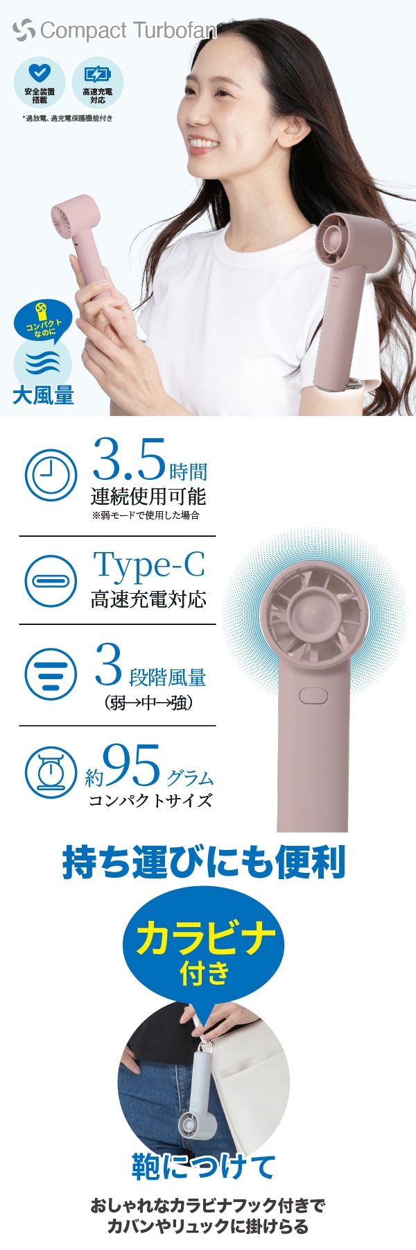 【ピンク】コンパクトターボハンディファン | コンパクトなのに超パワフル!涼しさ、想像以上!