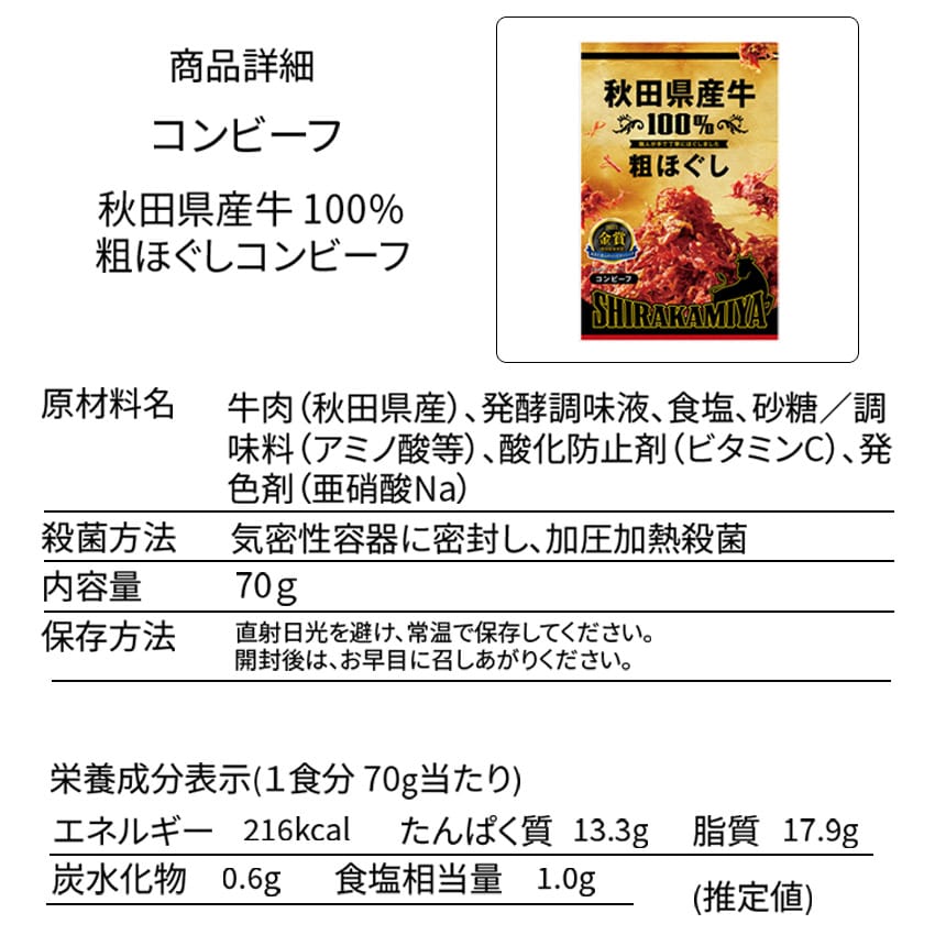 ・原材料/材質/素材:牛肉(秋田県産)、発酵調味液、食塩、砂糖/調味料(アミノ酸等)、酸化防止剤(ビタミンC)、発色剤(亜硝酸Na)