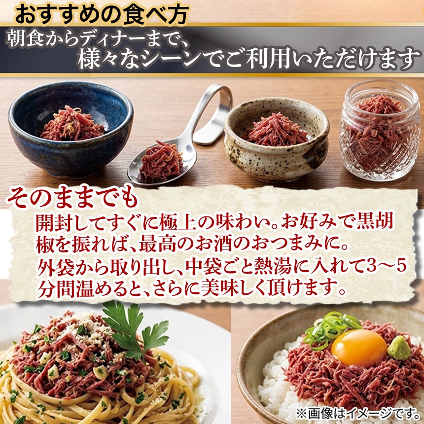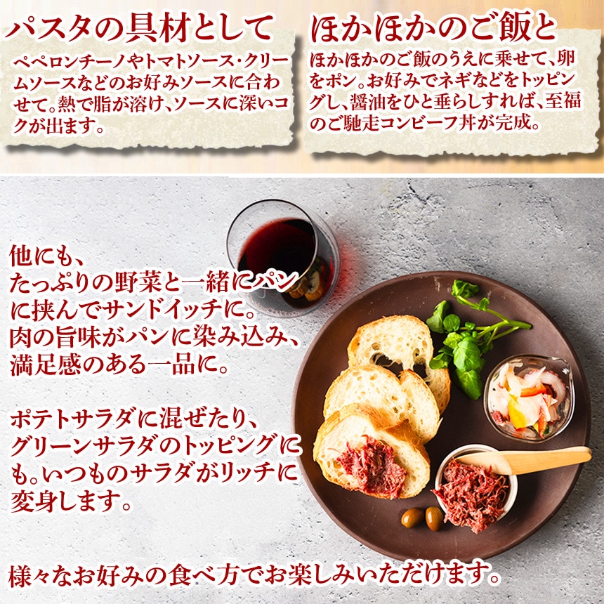 ・お召し上がり方:袋から取り出してそのままお召し上がりいただけます。お酒のおつまみとしてやパスタやサラダの具材にも。温かい炊きたてのご飯に乗せれば、脂が溶け出し至福の「コンビーフ牛丼」に。また、バゲットやクラッカーの上にそのまま添えるだけで、オシャレで高級なお酒のお供にとしてもご利用いただけます。外袋から出し、中袋ごと熱湯に入れて3から5分温めていただくと、肉の脂が溶け出しさらに美味しくいただけます。