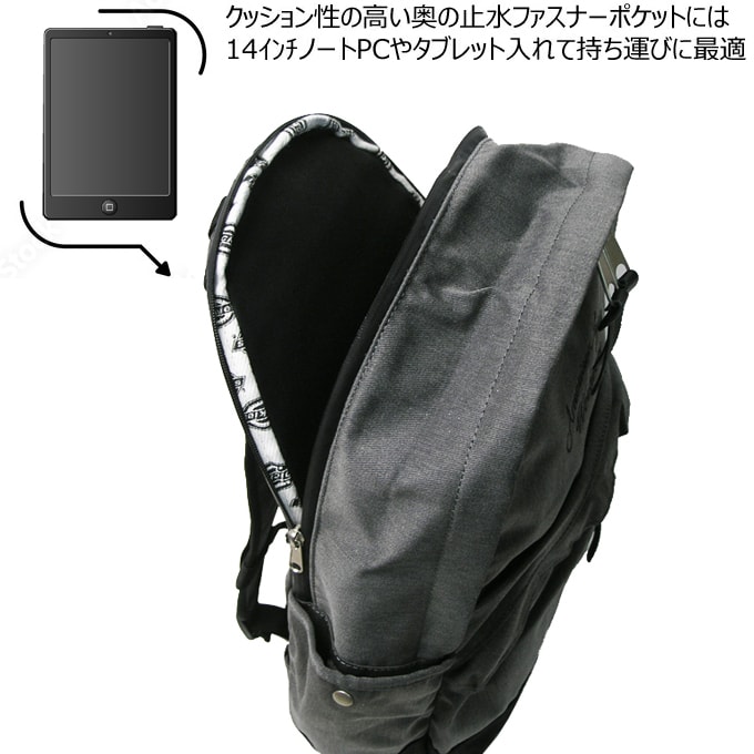 収納 外側:ファスナーポケット×2/止水ファスナーx1(14インチノートPCまで収納可能)/両サイドオープンポケット×2