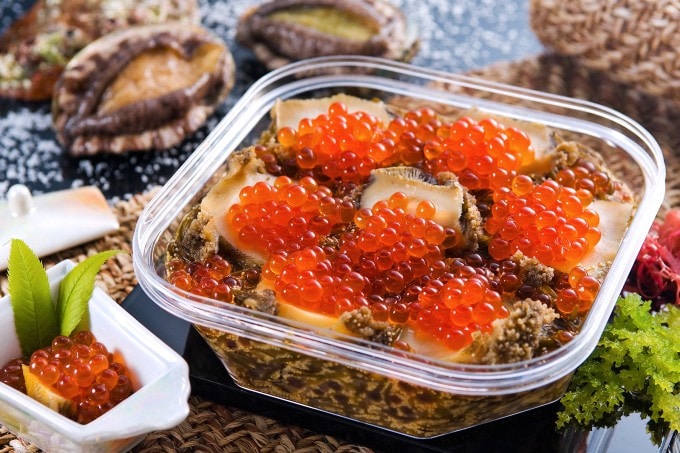 めかぶ醤油漬(めかぶ(三陸産)、しょうゆ、カラフトシシャモ卵、砂糖、みりん、唐辛子、食塩)(国内製造)、いくら醤油漬(鮭卵(アメリカ産、国産)、しょうゆ、砂糖、清酒、醸造酢)、煮あわび(あわび(三陸産)、清酒、食塩)/酒精、調味料(アミノ酸等)、カラメル色素、酸味料、増粘剤(キサンタンガム)、甘味料(カンゾウ)(一部に小麦・あわび・いくら・大豆を含む)