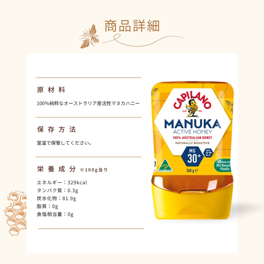 【340g×3本】カピラーノアクティブマヌカハニーMG30+ 100%オーストラリア | 契約養蜂場のはちみつだけを使用
