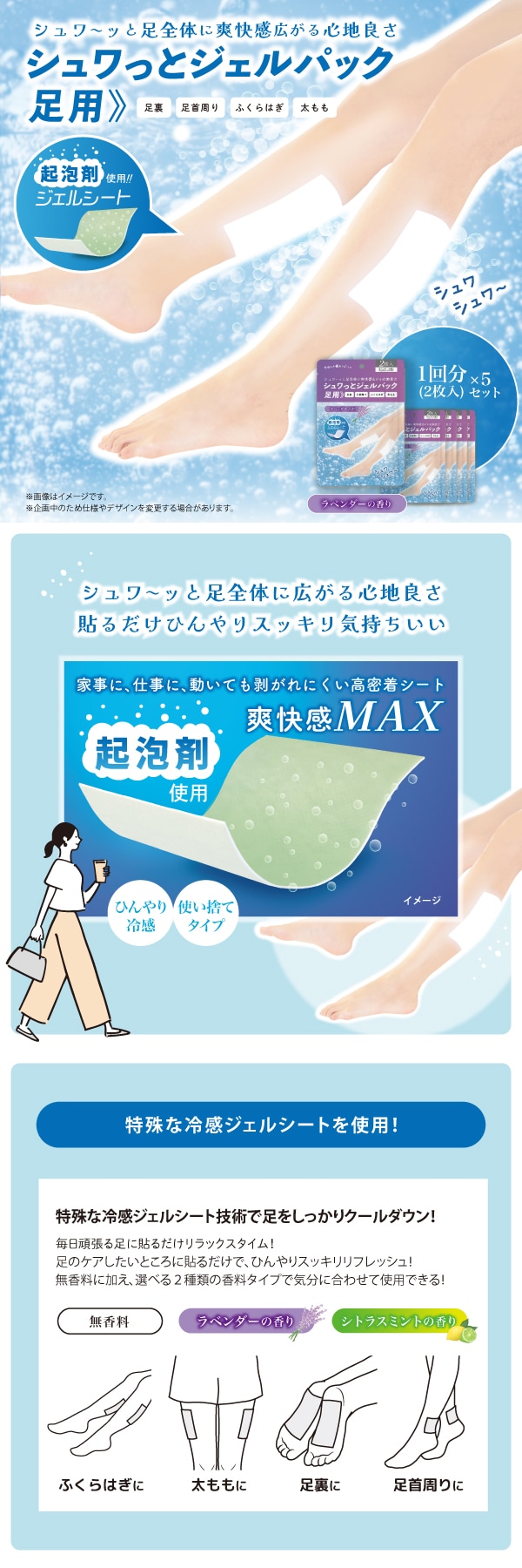 【1回分(2枚)×5袋/ラベンダー】足ラクシート10枚入 シュワっとジェルパック | シュワーっと足全体に爽快感広がる心地よさ、貼るだけひんやりスッキリ気持ちいい!