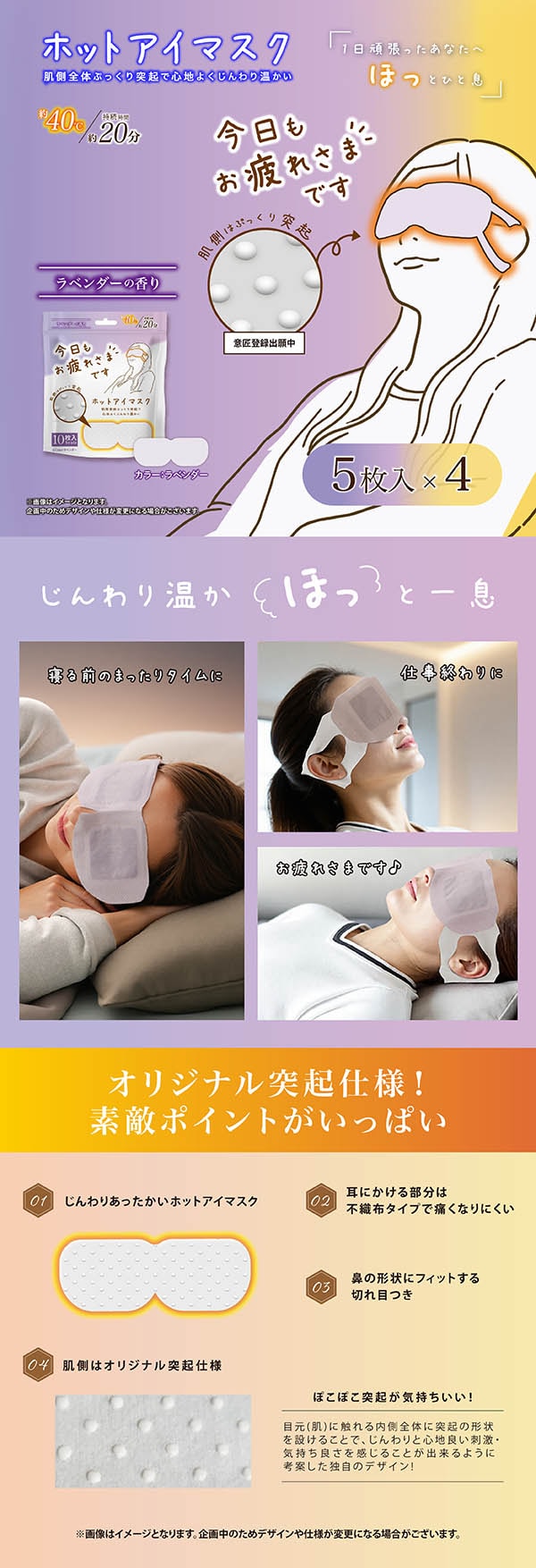 【日替わり数量限定】【ラベンダーの香り/20枚入(5枚入×4袋)】お疲れさまです粒々ホットアイマスク | 肌側全体ぷっくり突起で心地よくじんわり温かい
