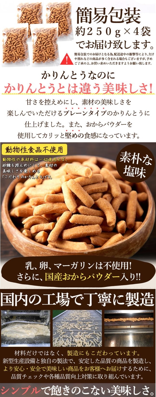【お徳用1kg】堅あげ おから入りプレーンかりんとう(250g×4袋) | おからパウダー入り!乳、卵、マーガリン不使用!素朴な塩味で噛む程に素材の甘さが引き立ちます