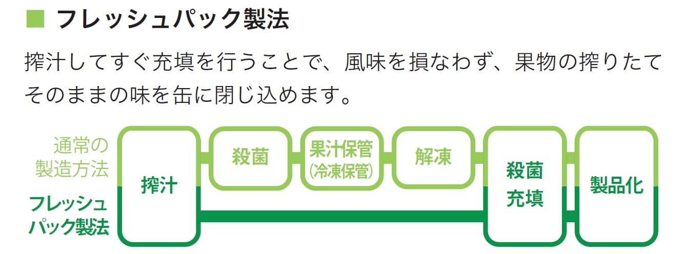 ◆ 搾汁から缶への充填を一貫して行い、搾りたてをそのままパック(フレッシュパック)。