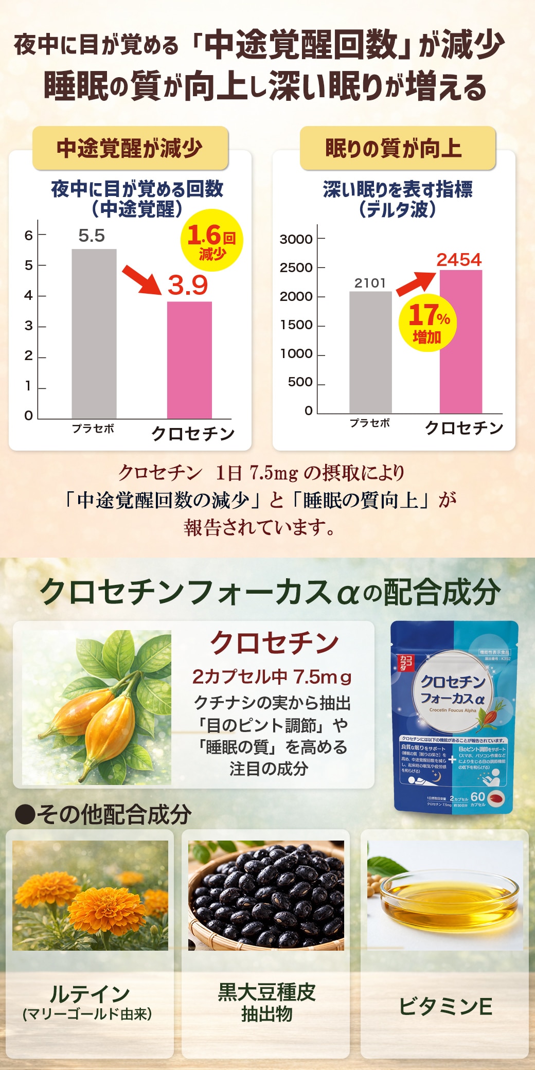 本品にはクロセチンが含まれます。クロセチンには、良質な眠りをサポートする(睡眠の質(眠りの深さ)を高め、中途覚醒回数を減らし、起床時の眠気や疲労感を和らげる)ことが報告されています。