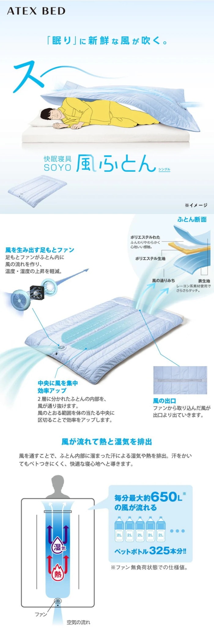 ふとん内に新鮮な風が吹く!快眠寝具 SOYO 風ふとん AX-BSA620 | 寝苦しい時期、熱帯夜でも眠りに新鮮な風が吹いて、快適な寝心地に!