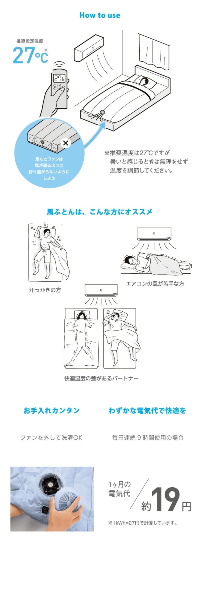 2層に分かれたふとんの内部を風が通り抜けます。風の通る範囲を体の当たる中央に区切ることで効率をアップします。