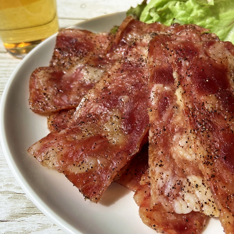 ・原材料/材質/素材:ショルダーベーコン(国内製造)、ブラックペッパー/リン酸塩(Na)、調味料(アミノ酸)、増粘多糖類、酸化防止剤(ビタミンC)、くん液、発色剤(亜硝酸Na)、(一部に豚肉・大豆を含む)