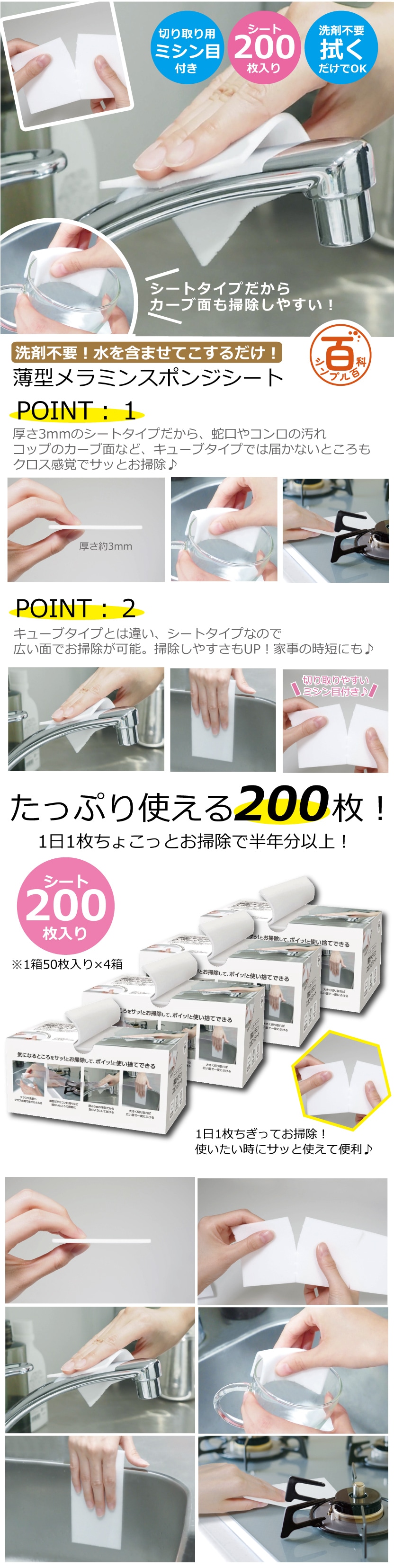 薄型メラミンスポンジシート50枚入×4個セット(200枚入) | シートタイプだからカーブ面もお掃除しやすい!洗剤不要で水を含ませて拭くだけ♪