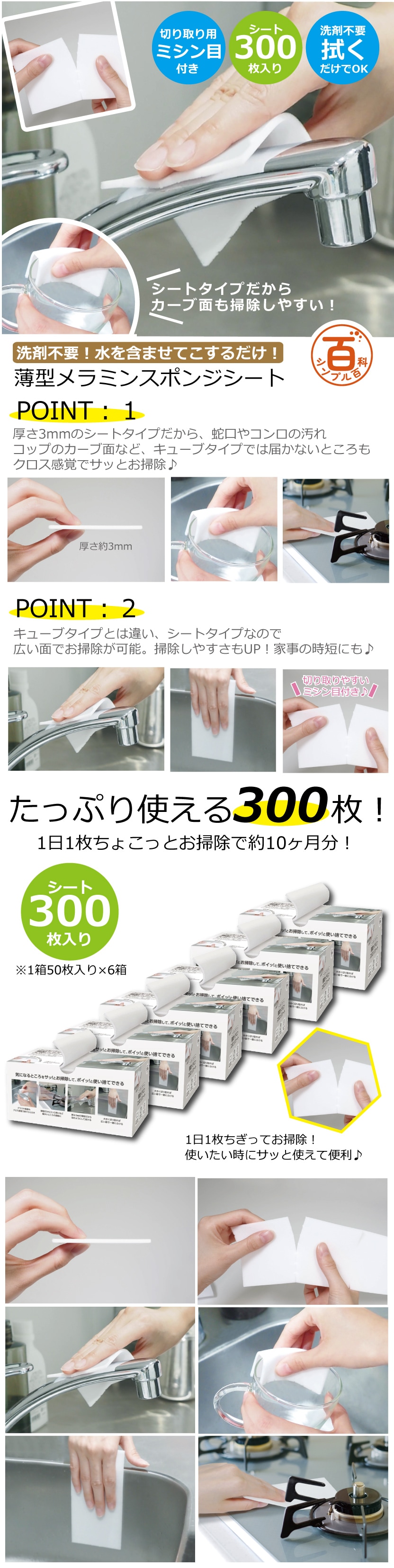 薄型メラミンスポンジシート50枚入×6個セット(300枚入) | シートタイプだからカーブ面もお掃除しやすい!洗剤不要で水を含ませて拭くだけ♪