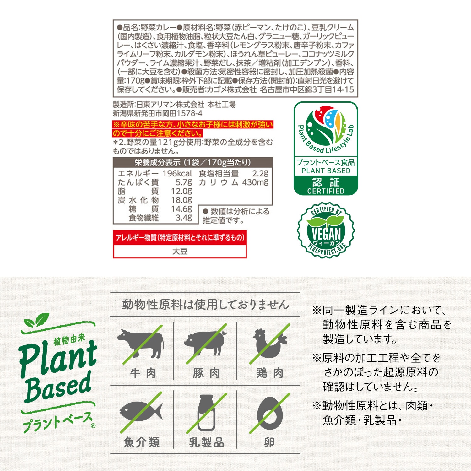 ココナッツミルクのまろやかな甘さと、爽やかなハーブやライムの香りが広がります。野菜の甘味や旨味とスパイシーな味わいがくせになる、動物性原料不使用※でも食べ応えのある美味しさが特徴です。※同一製造ラインにおいて、動物性原料を含む商品を製造しています。※原料の加工工程や全てをさかのぼった起源原料の確認はしていません。※動物性原料とは、肉類・魚介類・卵・乳製品・はちみつなどを指します。