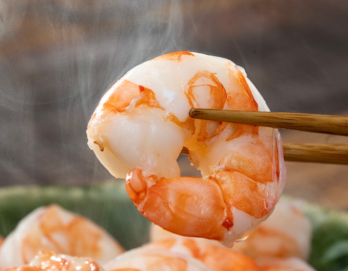 ムキエビ表面の氷を流水で溶かすと調理中の旨味流出が少なくより味が濃厚に楽しめます。