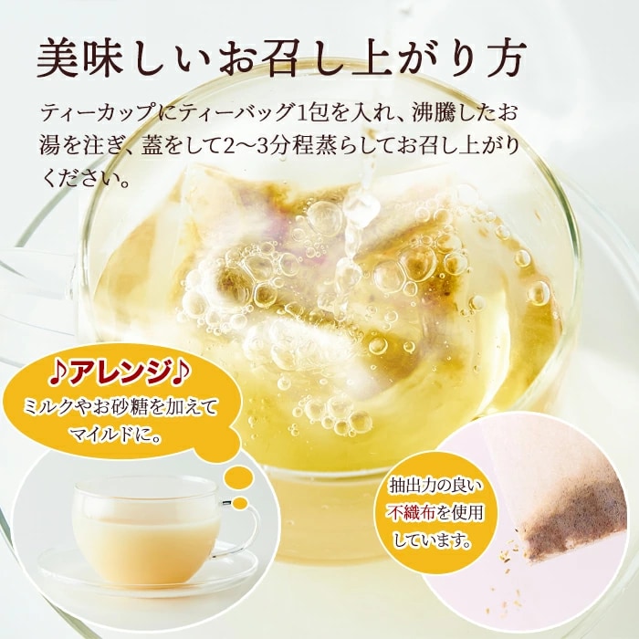 ・お召し上がり方:ティーカップにティーバッグ1包を入れ、沸騰したお湯を注ぎ、蓋をして2、3分程蒸らしてお召し上がりください。