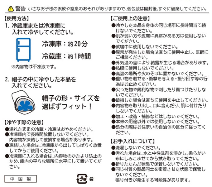 - 帽子本体×1、あご紐×1、クールパッド×1