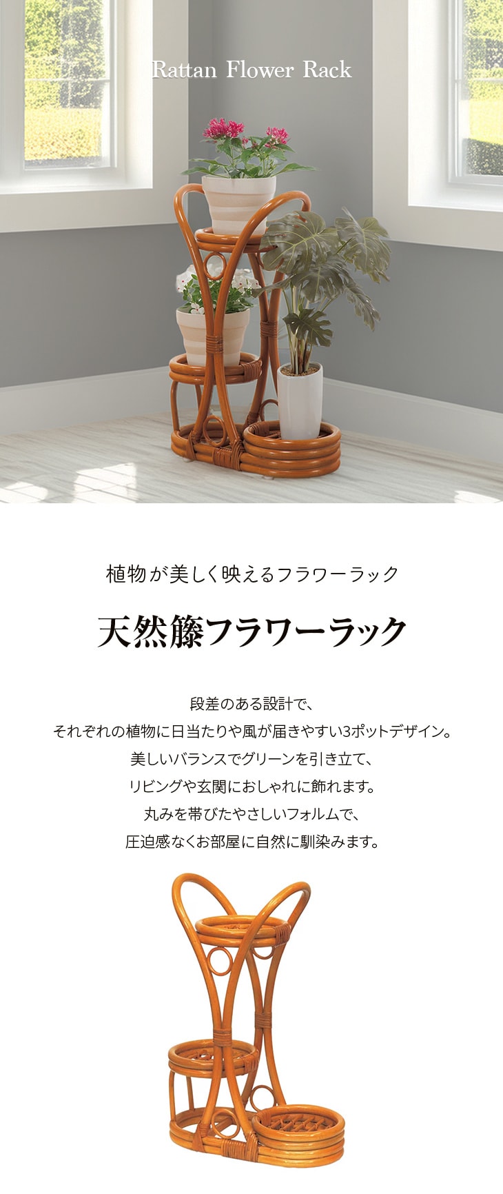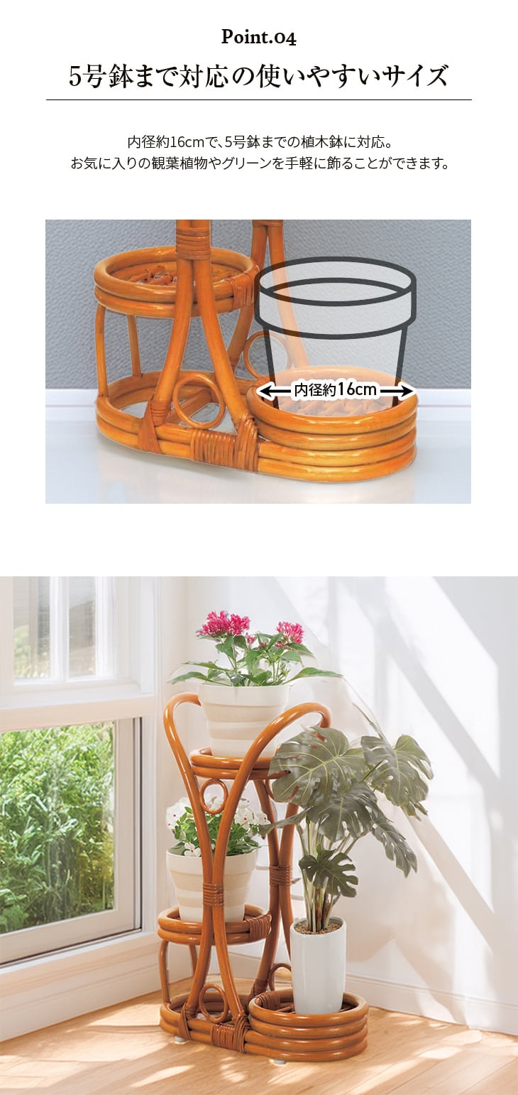 天然籐の柔らかな曲線がグリーンの魅力を引き立て、3段の段差設計でどの日当たりの良い特等席を作ります。