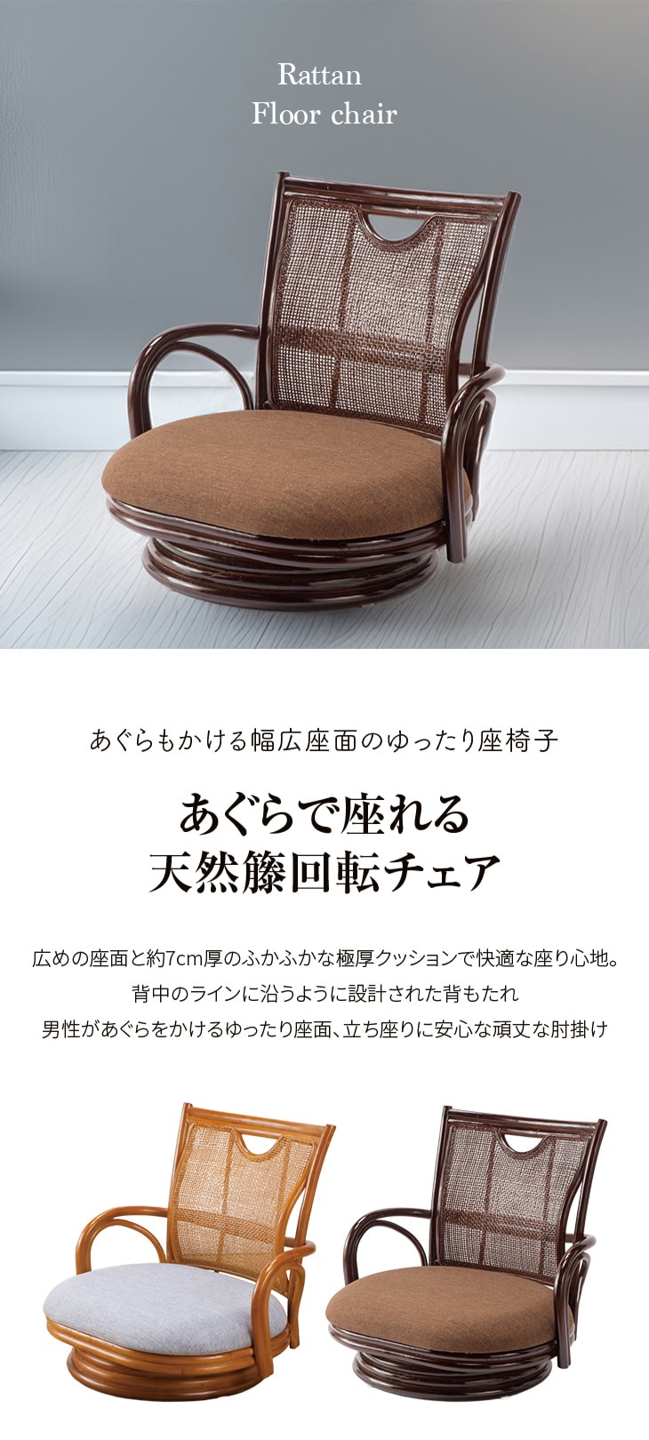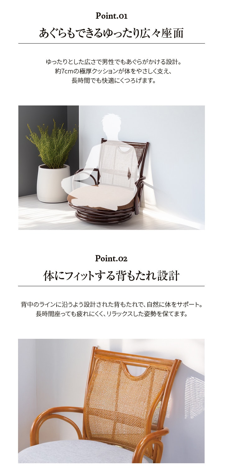天然籐(ラタン)を贅沢に使用し、座り心地の良さを徹底追求した「あぐらもかける幅広座面のゆったり天然籐回転座椅子」が登場。