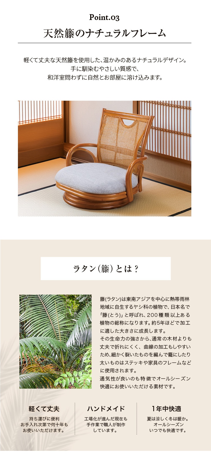 しっかりとした太さのある天然籐の肘掛けを装備。立ち上がる際や座る際に両手で体重を支えられるため、膝に不安がある方でもスムーズに動作が行えます。360度回転式なので、椅子を引かずに体の向きを変えられて便利です。