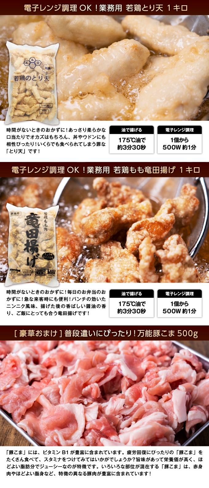 【計2.5kg】若鶏とり天&竜田揚げ+豚コマおまけ付 | レンジで簡単調理♪普段の食卓に、早くお手軽に!今なら、豚コマ500gおまけ付き!
