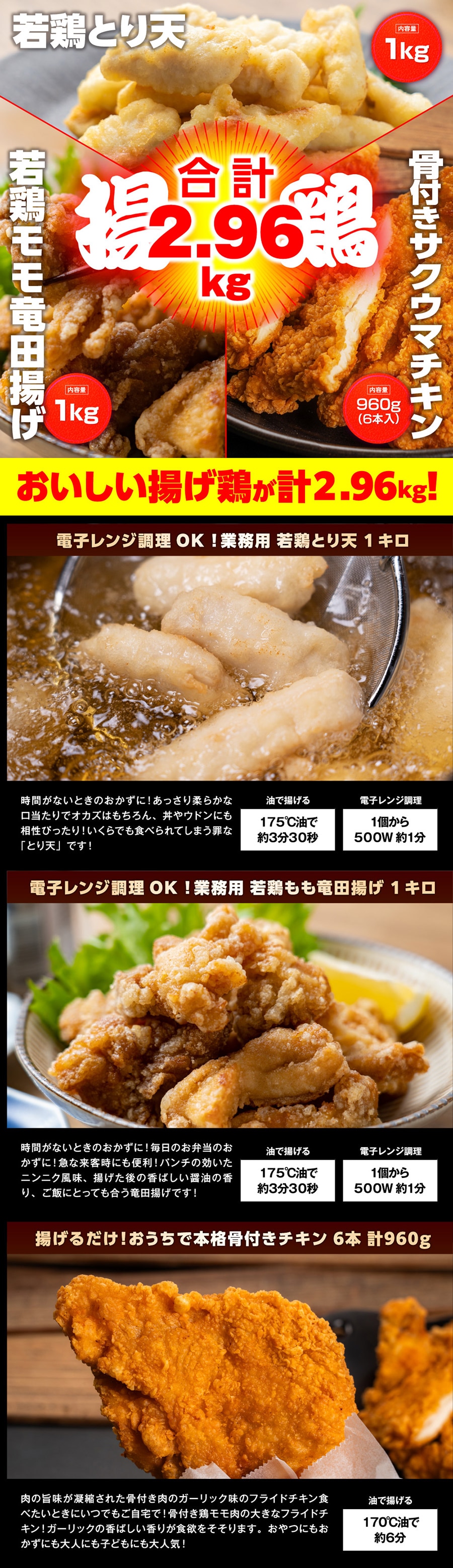 【2.96kg】若鶏とり天&竜田揚げ&サク旨チキン | プロも認める業務用おいしい揚げ鶏シリーズ!レンジで簡単調理♪普段の食卓に早くお手軽に♪