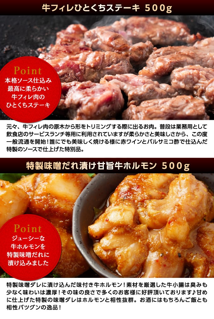 1kg/牛フィレ&牛ホルモン食べ比べセット | 柔らかく上質な牛フィレひとくちステーキ&特製味噌だれ漬け牛ホルモンの食べ比べセットです!