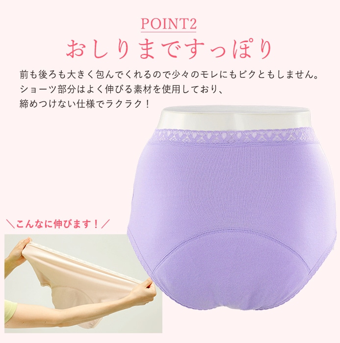 【ラベンダー/3Lサイズ】おしりまですっぽり超安心ショーツ 3枚組 | 4層構造に加え、吸水パッド範囲を広げた60ccまで対応の安心ショーツ!