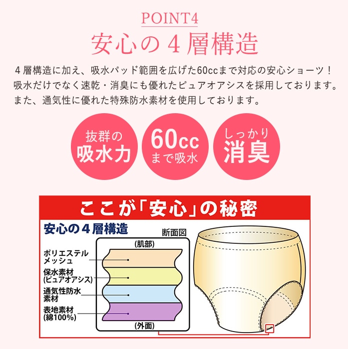 ★4層構造に加え、吸水パッド範囲を広げた60ccまで対応の安心ショーツ!