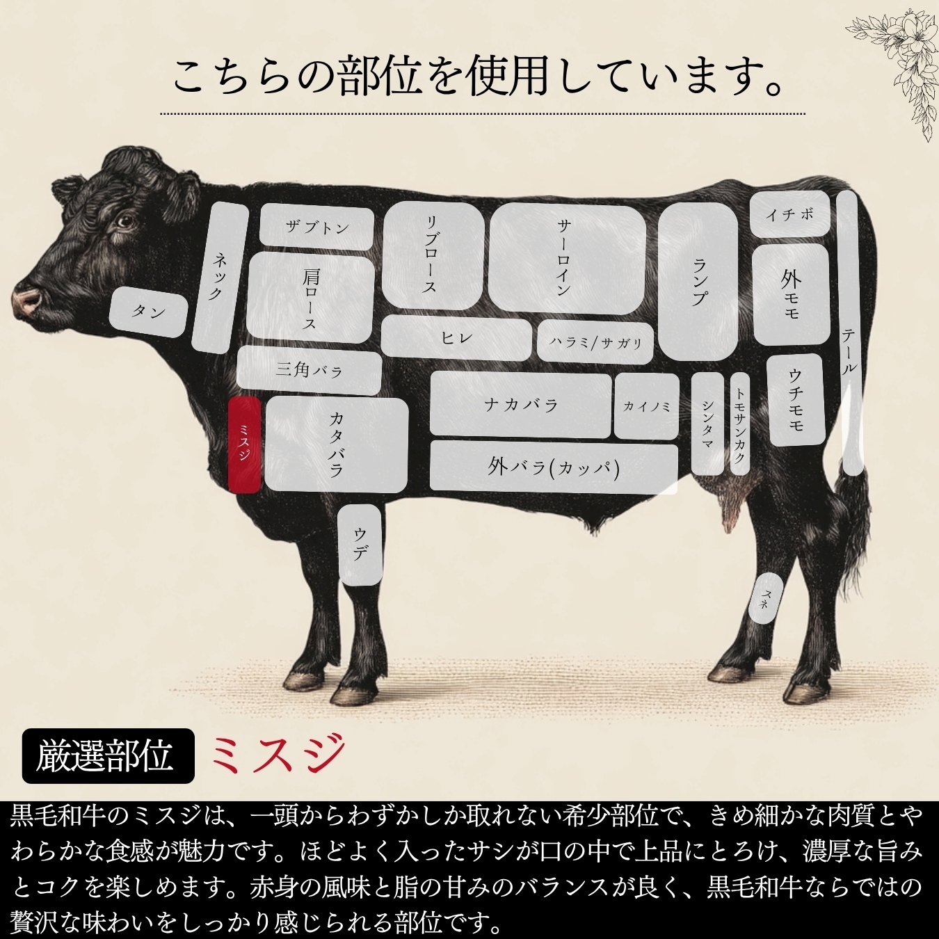 1.一頭からわずかしかとれない「幻の希少部位」ミスジ。その希少性が、お客様の食卓を特別な空間に変えます。
