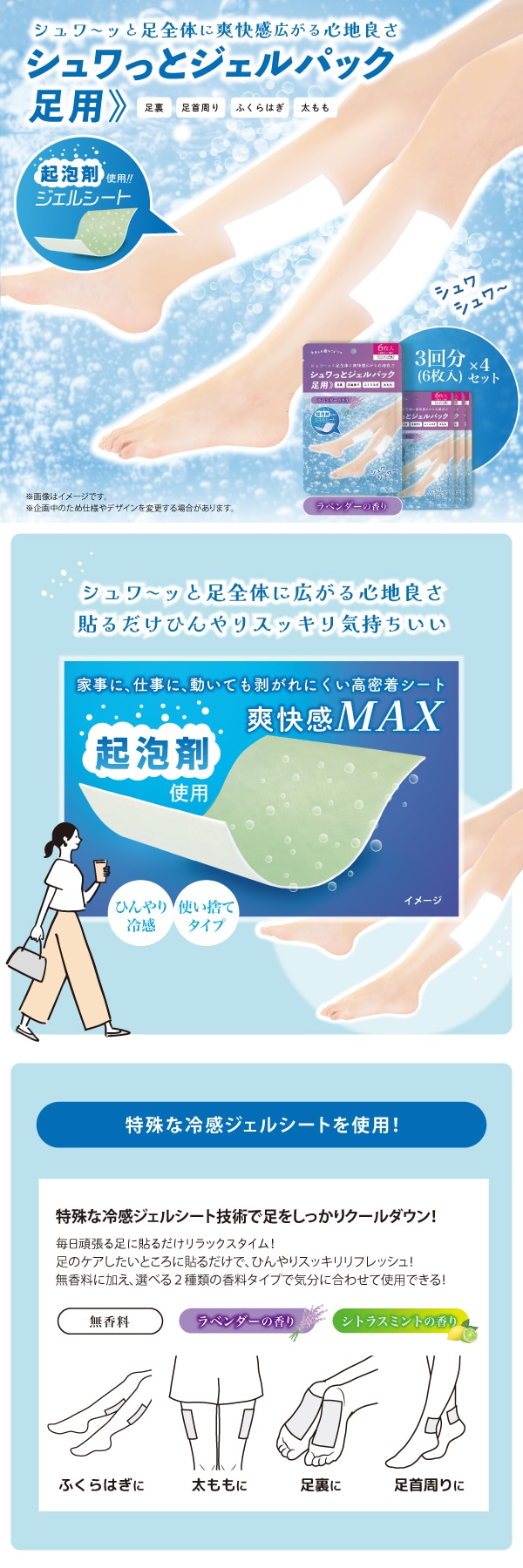 【日替わり数量限定】【3回分(6枚入)×4袋/ラベンダー】足ラクシート24枚入 シュワっとジェルパック | シュワーっと足全体に爽快感広がる心地よさ、貼るだけひんやりスッキリ気持ちいい!