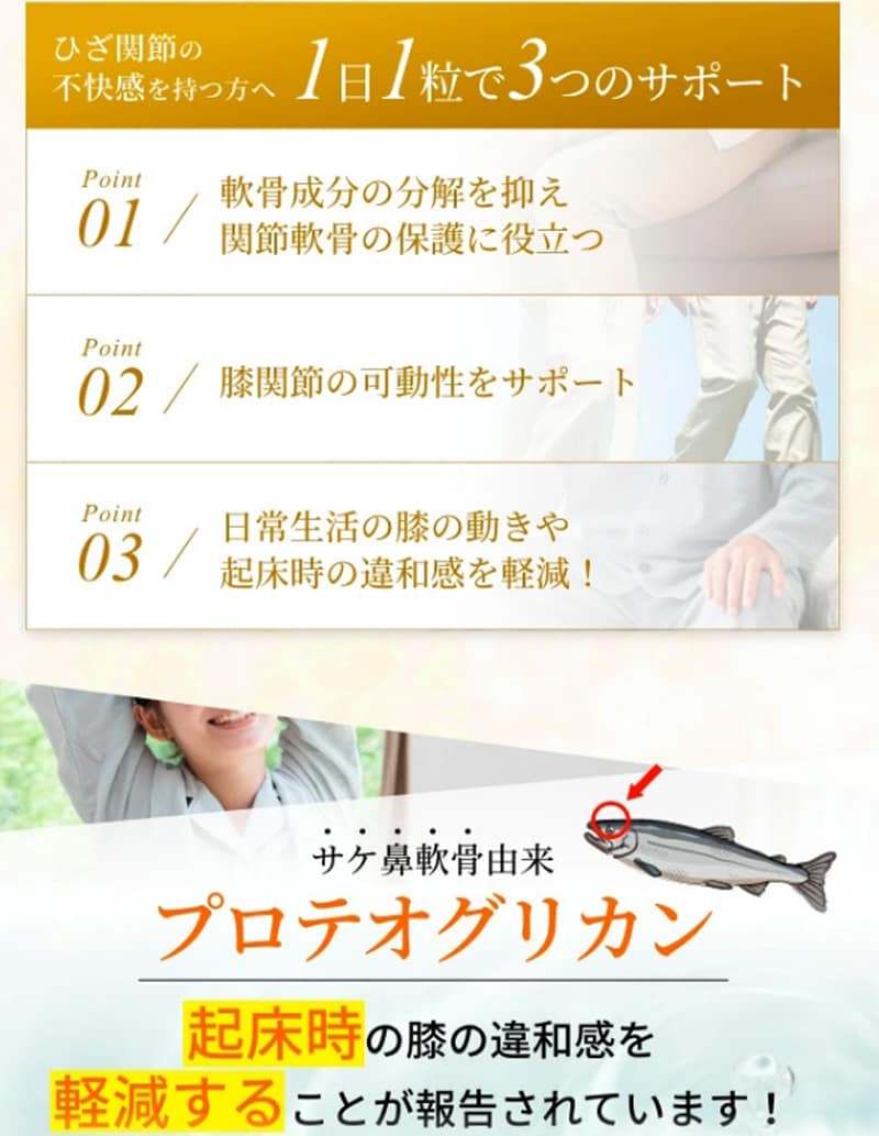 サケ鼻軟骨由来プロテオグリカンには、膝関節の不快感を持つ方の軟骨成分の分解を抑え、