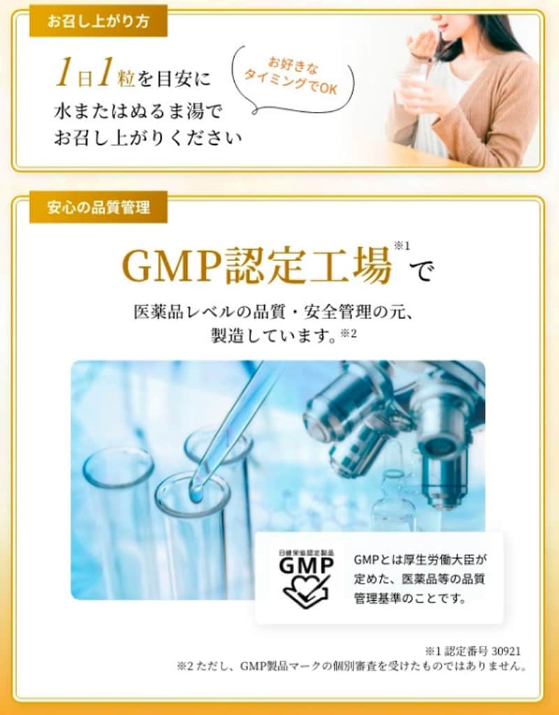 ・お召し上がり方:1日1粒を目安にそのまま水またはぬるま湯と一緒にお召し上がりください。