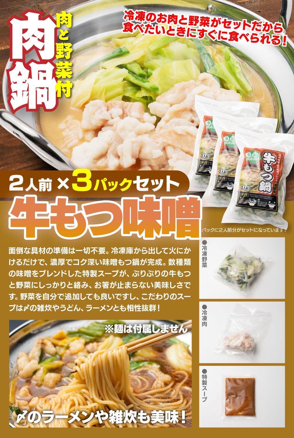 【牛もつ鍋味噌味】(キャベツ150g、牛しま腸110g、ニラ30g、濃縮味噌スープ75g)×3P