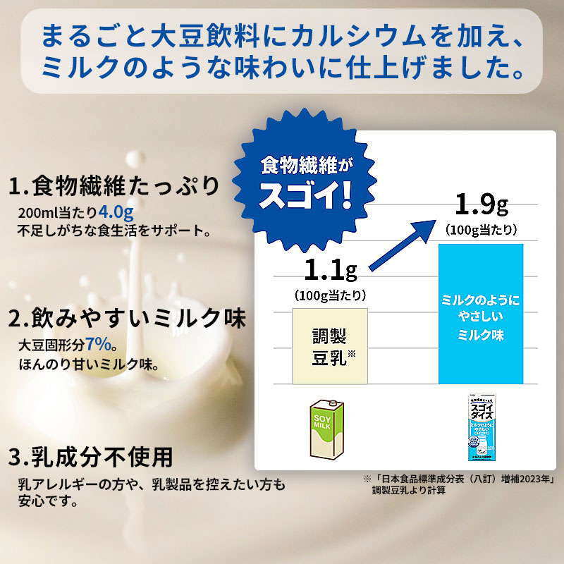 大豆固形分7%のまるごと大豆飲料にカルシウムを加え、ミルクのような味わいに仕上げました。食物繊維は200ml当たり4.0g。