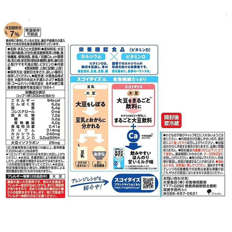 ・原材料/材質/素材:大豆粉(国内製造、分別生産流通管理済)、砂糖、食物繊維、植物油脂、食塩/炭酸Ca、pH調整剤、乳化剤、安定剤(増粘多糖類)、香料、酸化防止剤(ヤマモモ抽出物)、ビタミンD