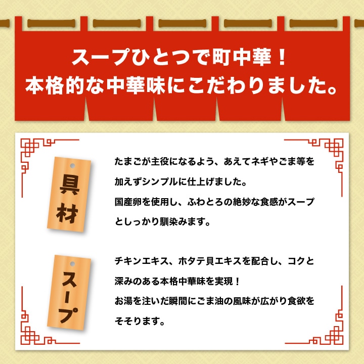 チキンエキス、ホタテ貝エキスを配合し、コクと深みのある本格中華味を実現!お湯を注いだ瞬間にごま油の風味が広がり食欲をそそります。