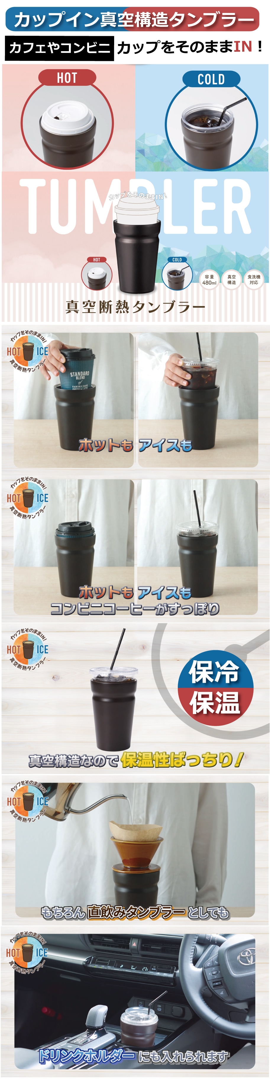 【日替わり数量限定】【2個セット】カップイン真空構造タンブラー | コンビニやコーヒーチェーン店のカップがそのまま入る!真空構造で保冷・保温しっかりキープ!