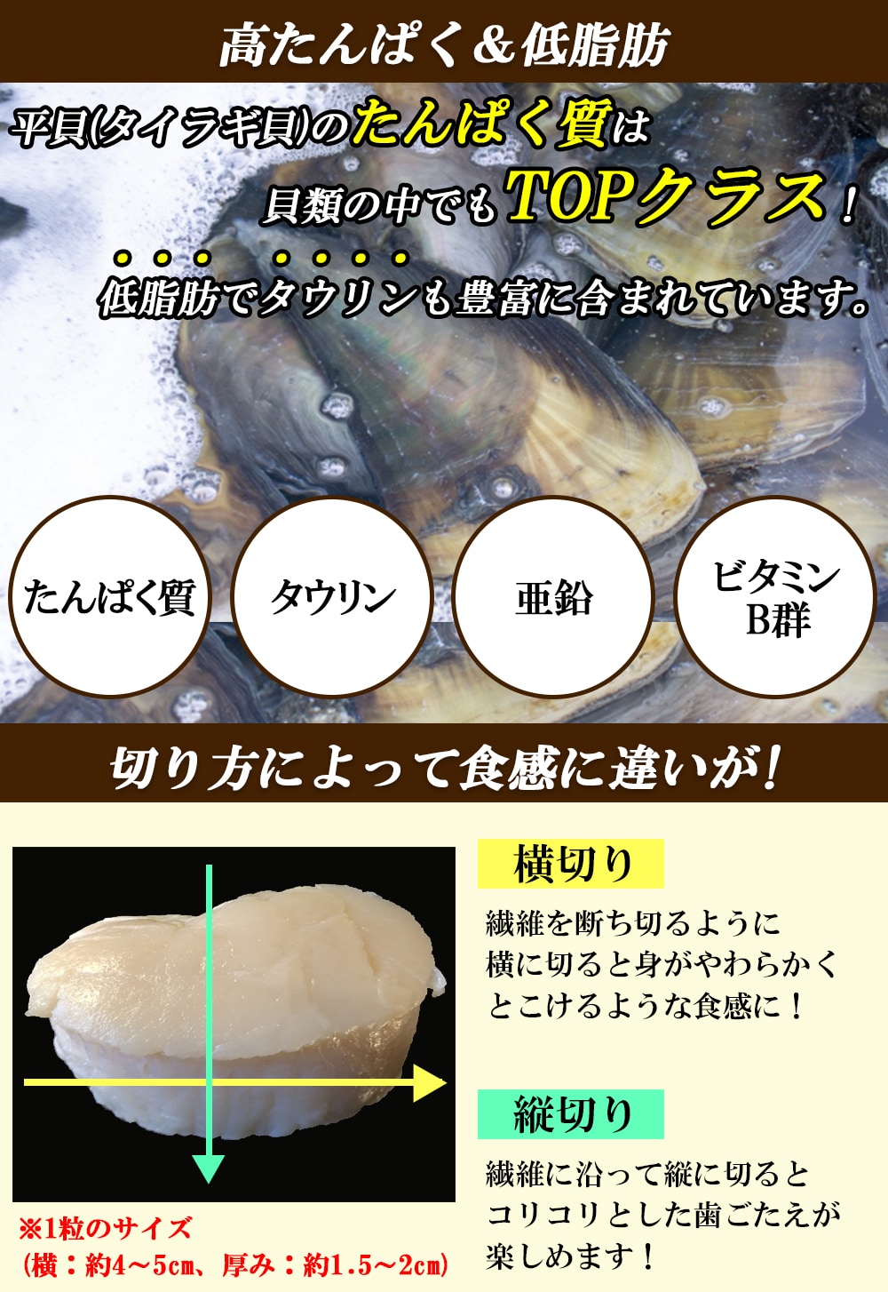 【日替わり数量限定】【計1kg/500g×2P】平貝貝柱 タイラギ貝(生食用) | 甘味と旨味が濃厚でしっかりとした歯ごたえがある美味しい貝です。
