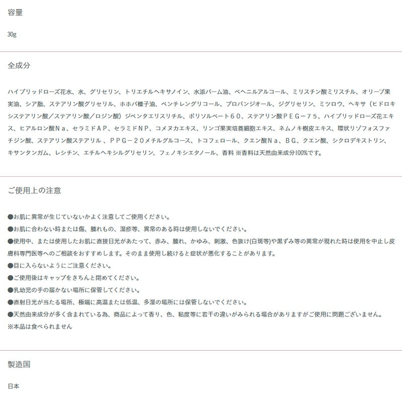 ・原材料/材質/素材:ハイブリッドローズ花水、水、グリセリン、トリエチルヘキサノイン、水添パーム油、ベヘニルアルコール、ミリスチン酸ミリスチル、オリーブ果実油、シア脂、ステアリン酸グリセリル、ホホバ種子油、ペンチレングリコール、プロパンジオール、ジグリセリン、ミツロウ、ヘキサ(ヒドロキシステアリン酸/ステアリン酸/ロジン酸)ジペンタエリスリチル、ポリソルベート60、ステアリン酸PEG-75、ハイブリッドローズ花エキス、ヒアルロン酸Na、セラミドAP、セラミドNP、コメヌカエキス、リンゴ果実培養細胞エキス、ネムノキ樹皮エキス、環状リゾフォスファチジン酸、ステアリン酸ステアリル 、PPG-20メチルグルコース、トコフェロール、クエン酸Na、BG、クエン酸、シクロデキストリン、キサンタンガム、レシチン、エチルヘキシルグリセリン、フェノキシエタノール、香料 ※香料は天然由来成分です。