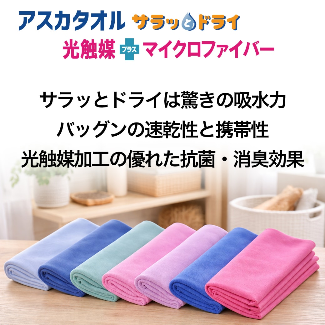 「サラッとドライ」は、抜群の吸水性に光触媒加工を施したタオルです。“マイクロファイバー”は、 太さが髪の毛の100分の1という超極細繊維で、繊維の1本1本が放射線状のV字型を形成しており、その隙間に大量の水分を素早く吸い込んでくれます。 さらに吸い取った水を素早く空気中に放出する速乾性にも優れています。 クリーンな光の力で細菌や汚れなどを分解する、光触媒加工も施してあります。