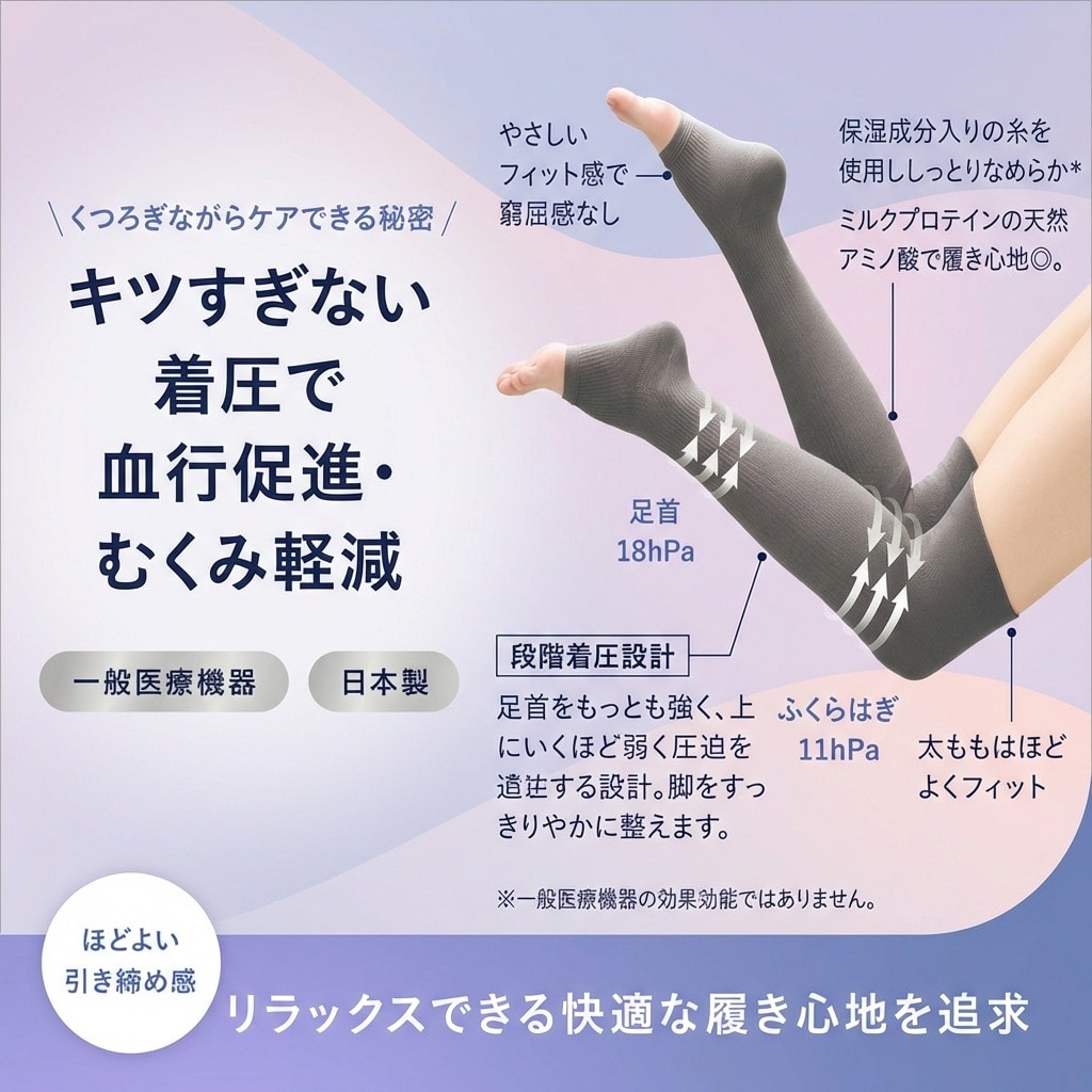仕事や外出、普段の生活でむくみが気になる方、寝ている間にケアをしたい方におすすめの商品です。