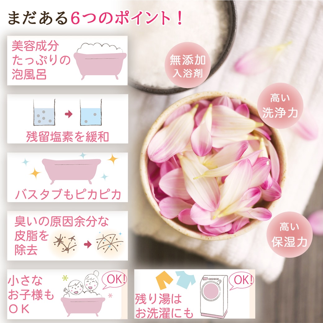 ◆お湯をはる前に指定量の本品をバスタブの底に入れておくと、パウダーが溶けやすくなり、モコモコとした泡のお風呂が楽しめます。