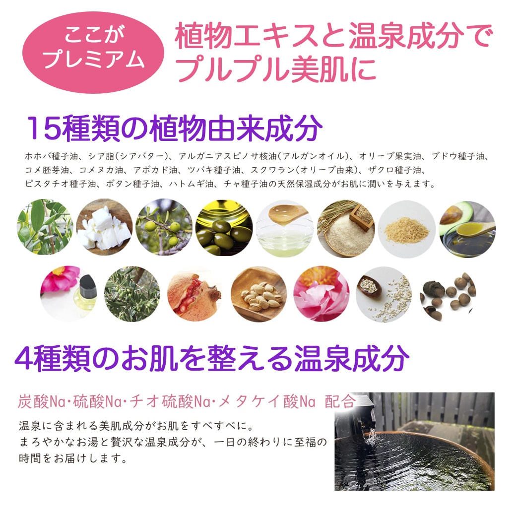 ・原材料/材質/素材:硫酸Na、炭酸Na、デキストリン、ラウロイルメチルアラニンNa、コカミドプロピルベタイン、ヤシ脂肪酸K、グリセリン、ホホバ種子油、シア脂(シアバター)、アルガニアスピノサ核油(アルガンオイル)、オリーブ果実油、ブドウ種子油、コメ胚芽油、コメヌカ油、アボカド油、ツバキ種子油、スクワラン(オリーブ由来)、ザクロ種子油、ピスタシオ種子油、ボタン種子油、ハトムギ油、チャ種子油、シリカ、チオ硫酸Na、メタケイ酸Na