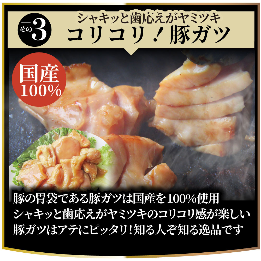 ・原材料/材質/素材:シマチョウ、豚ガツ、牛ギアラ、醤油、砂糖、リンゴ果汁、にんにく、本みりん、レモン果汁、植物油、ごま、玉ねぎエキス、生姜、ネギエキス、酵母エキス、コショー、唐辛子、調味料(アミノ酸等)、増粘剤(キサンタン)、みそ、アミノ酸液、ごま脂、醸造酢、香辛料、酒精(原材料の一部に小麦、大豆、りんご、ごま、豚を含む)