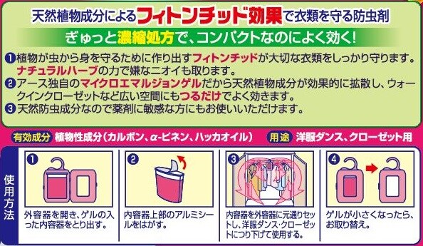 ●アース独自のマイクロエマルジョンゲルだから天然植物成分が効果的に拡散し、ウォークインクローゼットなど広い空間にもつるだけでよく効きます。