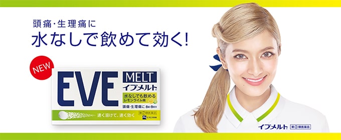イブメルトは、口の中でラムネのようにサッと溶ける、飲みやすさを追求した錠剤(口腔内崩壊錠)です。外出先など水がすぐ飲めないときでも服用することができます。従来の錠剤やカプセル剤を飲むのが苦手な方にも飲みやすい製品です。