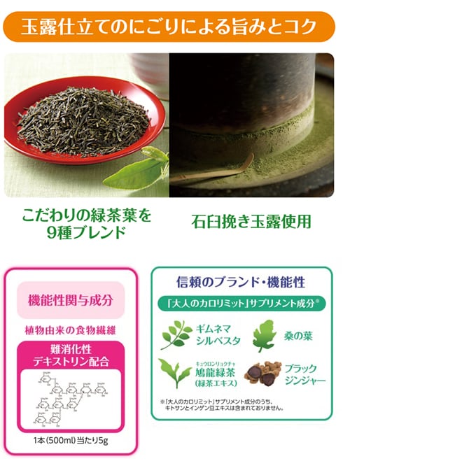 ●焙煎方法が異なるこだわりの9種の緑茶葉と、石臼挽き玉露に、「大人のカロリミット」のサプリメント素材であるギムネマシルベスタ、桑の葉、鳩龍緑茶、ブラックジンジャーの4種をバランスよく配合。機能性と緑茶本来のおいしさを両立した旨味やコクのある味わいに仕上げました。